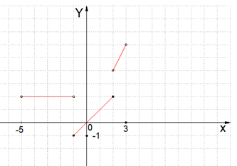 W przedziale od – 5 do – 1 funkcja jest stała. Ponieważ przedział argumentów z prawej strony jest zamknięty, a wartości w przedziale 4–6 są przedziałem otwartym, to przy wartości 6 kółeczko będzie otwarte i dodatkowo należy zaznaczyć inny argument z kółeczkiem zamkniętym o wartości różnej od 6 i mieszczącej się w określonych przedziałach z polecenia