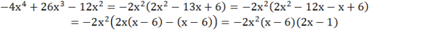 Wyciągasz przed nawias najwyższą wspólną potęgę zmiennej x razem z największym wspólnym dzielnikiem współczynników przy zmiennych razem z minusem. Następnie wyrażenie w nawiasie przekształcasz w sposób umożliwiający wyłączenie przed nawias wspólnego czynnika. Porządkujesz otrzymaną postać iloczynową.