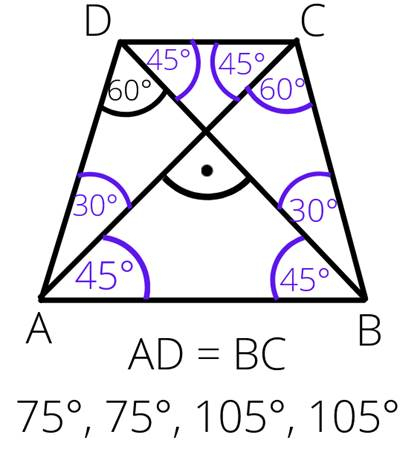 Trójkąty w środku są prostokątne równoramienne, natomiast trójkąty po lewej i prawej są prostokątne. Suma kątów przy jednym ramieniu trapezu zawsze jest równa 180°.