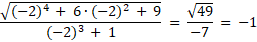 Sprawdź, czy licznik i mianownik są wielomianami. Wyznacz dziedzinę wiedząc, że mianownik musi być różny od zera, a wyrażenie pod pierwiastkiem stopnia parzystego musi być nieujemne i wylicz wartość dla -2.
