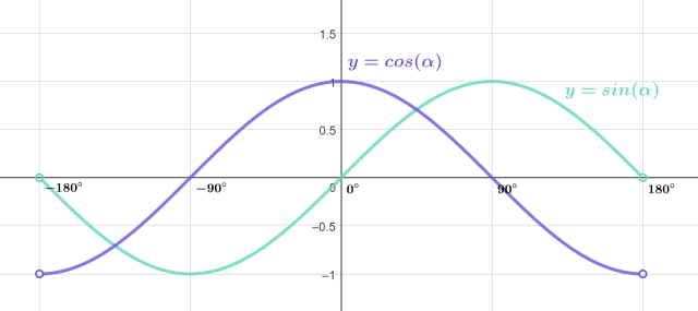 W jednym układzie współrzędnych naszkicuj wykresy funkcji y = sin α oraz y = cos α (sinusoidę i cosinusoidę). Dziedziną obu funkcji jest w tym przypadku podany przedział (-180°; 180°).