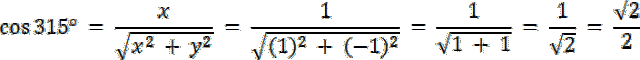 W pierwszym kroku sprawdź, w której ćwiartce znajduje się drugie ramię kąta 315°–jest w IV ćwiartce układu współrzędnych. Zauważ również, że 315° = 270° + 45°, więc kąt między osią OX, a drugim ramieniem kąta wynosi 45° (zobacz na rysunek w rozwiązaniu). Weź pod uwagę trójkąt CP0, który jest trójkątem prostokątnym, równoramiennym (posiada dwa kąty o wartości 45°, i jeden kąt prosty). Wiadomo również, że |C0| = |CP|, więc współrzędna x dla punktu C i punktu P będzie posiadać taką sama wartość, a odległość punktu P od C będzie równe wartości puntu x, czyli xc = xp = –yp, P(xc,–xc). Po wyznaczeniu współrzędnych x i y dla punktu P wyznacz wartości funkcji trygonometrycznych dla kąta 315°, korzystając z definicji, która uwzględnia współrzędne x, y.