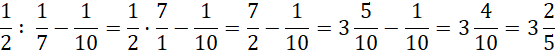 Pamiętaj, dzielenie należy wykonać przed odejmowaniem. Zastąp dzielenie mnożeniem przez odwrotność drugiego ułamka, a następnie sprowadź odjemną i odjemnik do wspólnego mianownika i odejmij od siebie ich liczniki. Wyłącz całości i wynik zapisz w postaci nieskracalnej.