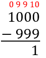 Najmniejszą liczbą czterocyfrową jest 1000, a największą trzycyfrową jest 999. Odejmij od wartości większej, mniejszą.