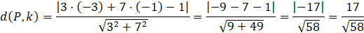 W tym zadaniu musisz obliczyć odległość punktu P od prostej k, wiedząc, że P(-3, -1), k: 3x + 7y = 1.