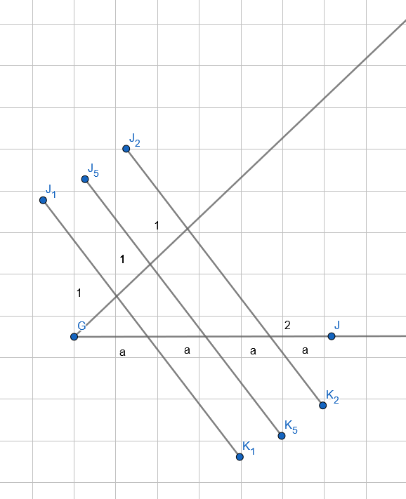 Skorzystaj z twierdzenia Talesa (jeżeli kąt zostanie przecięty prostymi równoległymi to stosunki odpowiednich odcinków będą równe) do budowania takich samych odległości między odcinkami..