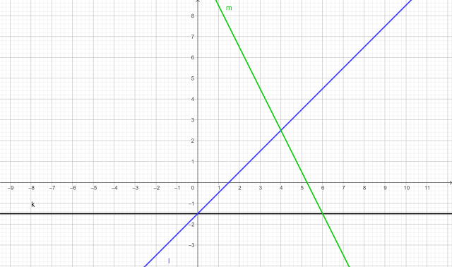 Narysuj proste k, l i m, a następnie podaj współrzędne wierzchołków trójkąta, który powstaje w miejscach przecięć prostych: