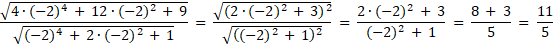 Sprawdź, czy licznik i mianownik są wielomianami. Wyznacz dziedzinę wiedząc, że mianownik musi być różny od zera, a wyrażenie pod pierwiastkiem stopnia parzystego musi być nieujemne i wylicz wartość dla -2.