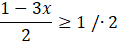 Aby wyznaczyć x z tej nierówności musisz wymnożyć obie strony nierówności przez mianownik (∙2), a następnie musisz dodać stronami niewiadomą x wraz z liczbą stojącą przy niej (+3x) i odjąć stronami liczbę niestojącą przy x (-2). Na końcu musisz podzielić obie strony równania przez liczbę stojącą przy niewiadomej (:3).