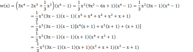 Rozkładamy wielomiany na czynniki korzystając z metody grupowania lub wyliczenia miejsc zerowych funkcji kwadratowej i jej postaci iloczynowej.