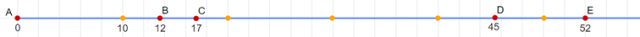 Odległość pomiędzy miejscowościami A i E wynosi 52 km.