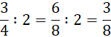 Zauważ, zamalowano trzy z czterech prostokątów, czyli trzy czwarte figury. Ten obszar z kolei podzielono na dwie części. Podziel ułamek przez liczbę naturalną: możesz rozszerzyć pierwszy ułamek i dzielić liczbę z licznika przez liczbę naturalną lub odczytać wynik z rysunku.