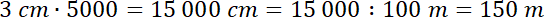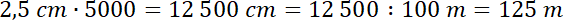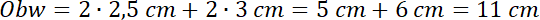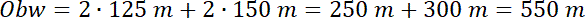 Skala mapy to 1 : 5000, więc wymiary na niej są 5000 razy mniejsze niż w terenie, dlatego, aby uzyskać prawdziwy wymiar, należy je pomnożyć przez tę liczbę. Oblicz obwody ze wzoru