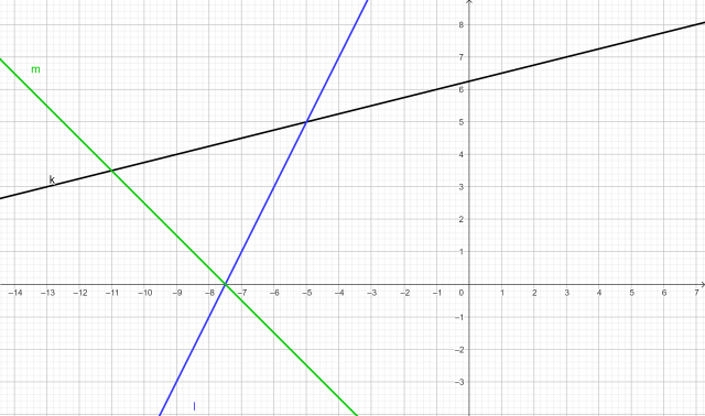 Narysuj proste k, l i m, a następnie podaj współrzędne wierzchołków trójkąta, który powstaje w miejscach przecięć prostych: