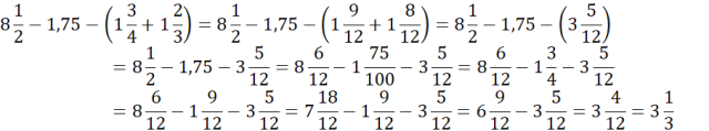 W tym zadaniu w pierwszej kolejności wykonaj odejmowanie ułamków w nawiasie zgodnie z kolejnością wykonywania działań, pamiętając, że minus przed nawiasem zmienia znak na przeciwny. Następnie zamień ułamki zwykłe na ułamki dziesiętne i wykonaj działania tzn. dodawanie oraz odejmowanie.