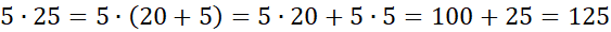 Liczbę 20 zapisujemy jako sumę 20 + 5. Następnie mnożymy 5 przez 20 oraz 5 przez 5. Na koniec dodajemy otrzymane wyniki.