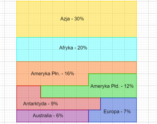 W tym zadaniu musisz zaznaczyć na kwadracie o boku długości 10 kratek, części powierzchni, jakie stanowią poszczególne kontynenty.
