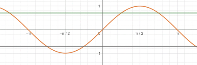 By rozwiązać zadanie, zacznij od obustronnego dodania 1 i podzielenia przez 2. Następnie spierwiastkuj nierówność, rozbijając ją tym samym na koniunkcję dwóch nierówności. Rozwiąż nierówności, posługując się wykresem funkcji