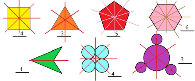 Narysuj wszystkie osie symetrii poniższych figur i napisz, ile ich jest.