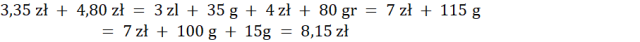 Oblicz cenę dwóch zeszytów razem. Koszty zeszytów to 3,35 zł i 4,80 zł.