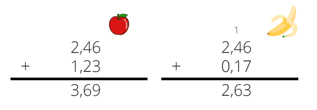 Aby obliczyć ilość jabłek, musisz powiększyć 2,46 o 1,23. Aby obliczyć ilość bananów, musisz powiększyć 2,46 o 0,17. Wykonaj dodawanie ułamków tak samo, jakbyś dodawał pisemnie liczby naturalne. Pamiętaj, że przecinki muszą być zapisane jeden pod drugim. Czasami żeby tak było, musisz dopisać do ułamka zero lub kilka zer. Jeżeli podczas dodawania pisemnego otrzymasz liczbę dwucyfrową, to przenieś jej dziesiątki do rzędu następnego (czyli o jedną liczbę w lewo).
