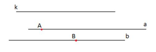 Zauważ, że jeśli dwie proste są równoległe, to gdy trzecia prosta jest równoległa do jednej z tych prostych, to jednocześnie wszystkie są ze sobą równoległe: jeśli k II a i k II b, to a II b.