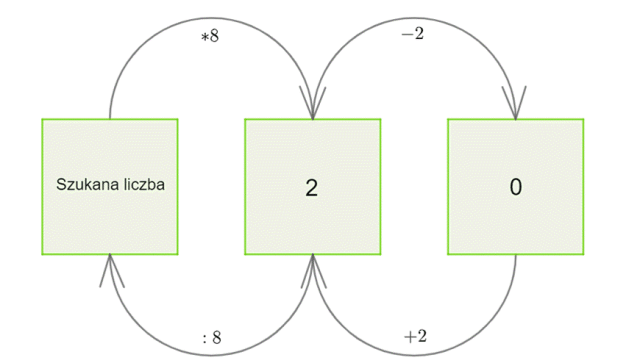 Nie znamy wartości liczby, o której pomyślał Tadek, więc umieśćmy ja w pierwszym polu grafu. Została ona powiększona 8 razy, czyli nad pierwszą strzałką znajdzie się to mnożenie. Wynik mnożenia, który później znajdzie się w środkowym polu, zmniejszono o 2, czyli nad drugą strzałką musisz wpisać odejmowanie. Te operacje dały nam liczbę 0, która znajdzie się w ostatnim polu. Teraz na dole zapisz strzałki biegnące w drugą stronę – od wyniku do szukanej liczby. Podpisz je działaniami odwrotnymi do tych, które znalazły się na górze (odejmowanie zamień na dodawanie, a mnożenie na dzielenie). Wykonuj działania zgodnie z kierunkiem strzałek – dojdziesz do wartości szukanej liczby.