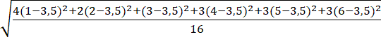 W tym zadaniu oblicz średnią arytmetyczną, odchylenie standardowe i odchylenie przeciętne tych danych, wiedząc, że na diagramie obok przedstawiono, ile razy wypadły poszczególne liczby oczek podczas serii rzutów kostką.
