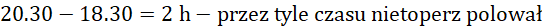 Najpierw oblicz, przez jaki czas nietoperz polował. Skoro zaczął o 18.30, a skończył o 20.30, to znaczy, że polował przez 2 h. Następnie oblicz, jaką drogę w tym czasie przebył, mnożąc czas, w którym polował razy prędkość, z jaką latał.