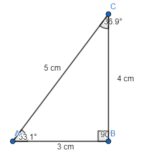 Narysuj i zmierz długość przeciwprostokątnej trójkąta prostokątnego, o przyprostokątnych 3 cm i 4 cm. Zmierz jego kąty ostre.