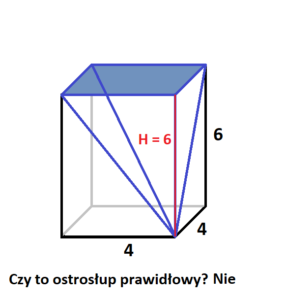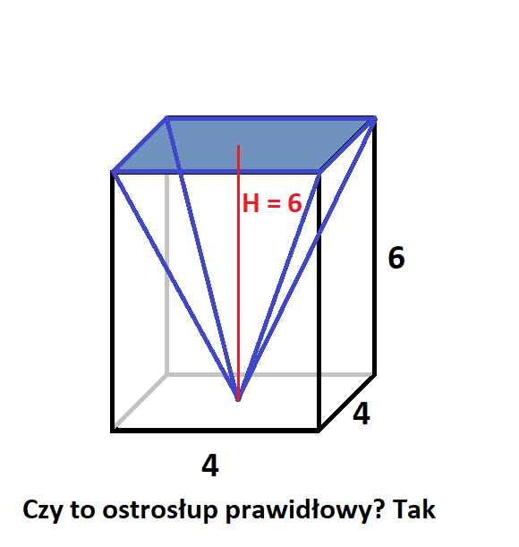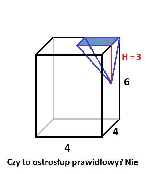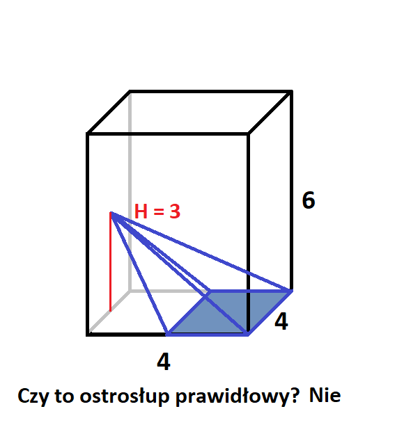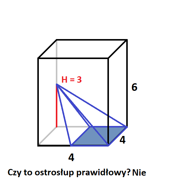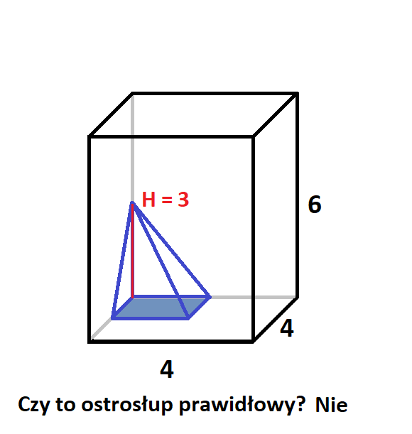 Podstawami ostrosłupów są czworokąty powstałe z połączenia ze sobą wybranych wierzchołków, środków ścian lub środków krawędzi. Wysokość w każdym z nich była równoległa do krawędzi bocznych prostopadłościanu i miała długość 3 lub 6. Ostrosłup jest prawidłowy wtedy, gdy w jego podstawie znajduje się wielokąt foremny, a spodek wysokości leży na przecięciu się przekątnych podstawy i tak było tylko na drugim rysunku.