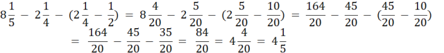 Sprowadzamy do wspólnego mianownika, dodajemy do siebie osobno całości i osobno liczniki części ułamkowych, na koniec zamieniamy ułamek niewłaściwy na liczbę mieszaną.