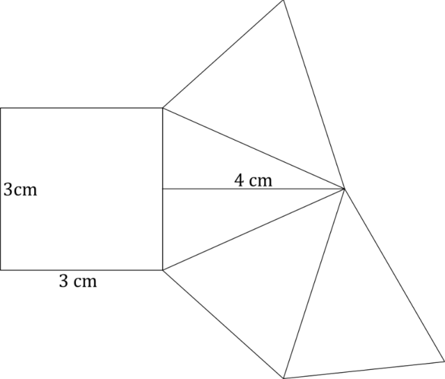 Pole powierzchni ściany bocznej to pole trójkąta, które jest równe połowie iloczynu długości boku i opuszczonej na niego wysokości. Ostrosłup ma 4 ściany boczne, więc pole powierzchni bocznej jest równe polu jednej ściany bocznej pomnożonemu razy 4.