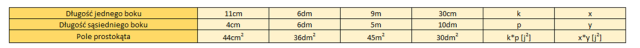 Wpisz w luki w tabeli brakujące długości boków lub pola.