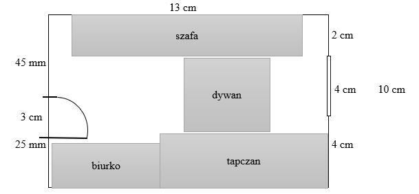 Zmierz boki prostokąta obrazującego pokój. Ustawiając meble, pamiętaj o drzwiach i oknie.