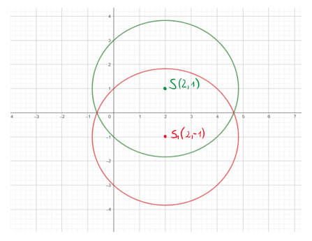 Wyznacz środek okręgu w symetrii osiowej względem osi OX, a następnie wyznacz równanie okręgu i narysuj okręgi w układzie współrzędnych.