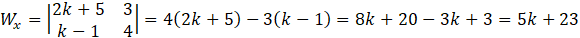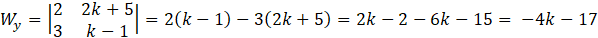Aby rozwiązać zadanie, wyznacz rozwiązania układu równań w zależności od parametru k, korzystając przy tym z metody wyznaczników. Następnie podstaw otrzymane rozwiązania do nierówności
