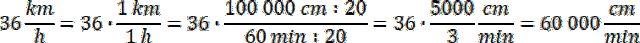 Aby móc porównać obie wielkości, przekształć prędkość sprintera tak, aby była wyrażona w cm/min. Aby przeliczyć km/h na cm/min, zamień kilometry w jednostce na odpowiadającą im liczbę centymetrów oraz godziny na odpowiadającą im liczbę minut.