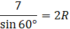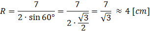 Aby obliczyć promień okręgu opisanego na trójkącie skorzystaj z twierdzenia sinusów zapisanego dla boku o długości 7 cm i kąta leżącego naprzeciw niego.
