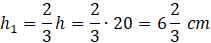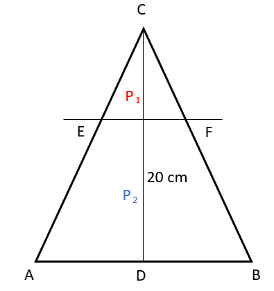 W pierwszym kroku wyznacz stosunek pól trójkątów EFC i ABC (pole trójkąta ABC jest sumą pól mniejszego trójkąta i trapezu). Następnie, ze stosunku pól odczytaj kwadrat skali podobieństwa trójkątów, po którego spierwiastkowaniu otrzymujemy skalę podobieństwa k. Znając skalę podobieństwa i wysokość większego trójkąta, możesz obliczyć wysokość mniejszego trójkąta.