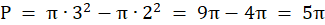 1. Pole zacieniowanej figury obliczasz jako różnicę pól kół o promieniach 3 i 2.