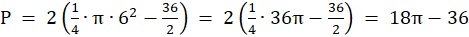 4. Pole zacieniowanej figury obliczysz jako sumę pól dwóch takich samych figur. Pole jednej takiej figury obliczymy jako różnicę pól: ćwiartki koła o promieniu 6 i trójkąta prostokątnego równoramiennego o przyprostokątnej 6.