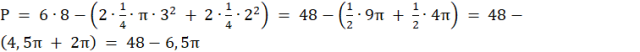 2. Pole zacieniowanej figury obliczasz jako różnicę pól: prostokąta o wymiarach 6x8 i sumy dwóch ćwiartek kół o promieniu 3 i dwóch ćwiartek kół o promieniu 2.