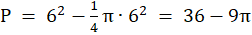 3. Pole zacieniowanej figury obliczysz jako różnice pól: kwadratu o boku 6 i ćwiartki koła o promieniu 6.