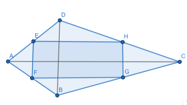 Jako że boki prostokąta łączą środki boków deltoidu, to można zastosować następujące rozumowanie. Nasz deltoid można rozbić na trójkąt np. ACD. Jeśli bok prostokąta EH łączy środki boków tego trójkąta to znaczy, że długość tego odcinka będzie równa połowie podstawy AC.