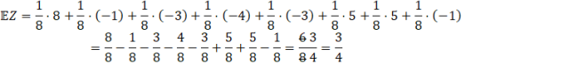 Aby obliczyć wartość oczekiwaną tej gry musisz obliczyć prawdopodobieństwa wylosowania każdego pola. Robisz to korzystając z klasycznej definicji prawdopodobieństwa dzieląc 1 (bo skupiamy się na jednym polu) przez ilość wszystkich pól, czyli 8. Następnie korzystasz z definicji wartości oczekiwanej. Pamiętaj, że stratę zapisuj jako ujemną wygraną.