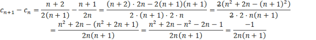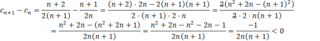 Podobnie jak w odpowiedzi A., gdy pojawia się różnica lub suma ułamków, to warto je sprowadzić do wspólnego mianownika. Warto nie wymnażać nawiasów przez 2, tylko wyciągnąć 2 przed nawias i skrócić. Otrzymane wyrażenie musisz oszacować, czy jest dodatnie czy ujemne. Pamiętaj, że n jest liczbą naturalną, a więc jest zawsze dodatnie. W mianowniku zawsze jest mnożenie dwóch liczb naturalnych (bo dodając 1 do liczby naturalnej i tak otrzymasz liczbę naturalną). Oznacz to, że mianownik ułamka będzie zawsze dodatni. Ale w liczniku jest -1, czyli liczba ujemna. Po podzieleniu liczby ujemnej, przez dodatnią otrzymasz liczbę ujemną. Oznacza to, że gdy od wyrazu następnego odejmiesz poprzedni, to dostaniesz coś ujemnego. Więc wyraz poprzedni jest większy od następnego, a więc ten ciąg jest malejący.
