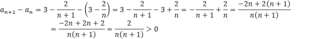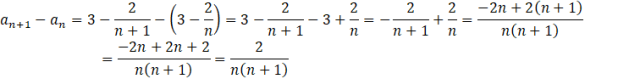 Na ogół, gdy pojawia się różnica lub suma ułamków, to warto je sprowadzić do wspólnego mianownika. Otrzymane wyrażenie musisz oszacować, czy jest dodatnie czy ujemne. Pamiętaj, że n jest liczbą naturalną, a więc jest zawsze dodatnie. W mianowniku zawsze jest mnożenie dwóch liczb naturalnych (bo dodając 1 do liczby naturalnej i tak otrzymasz liczbę naturalną). Oznacz to, że mianownik ułamka będzie zawsze dodatni. W liczniku jest 2, czyli liczba dodatnia. Po podzieleniu liczby dodatniej, przez dodatnią otrzymasz liczbę dodatnią. Oznacza to, że gdy od wyrazu następnego odejmiesz poprzedni, to dostaniesz coś dodatniego. Więc wyraz następny jest większy od poprzedniego, a więc ten ciąg jest rosnący.