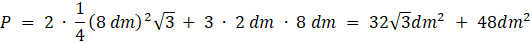Na pole powierzchni całkowitej składają się dwa trójkąty równoboczne o boku długości równej 8 dm oraz trzy prostokąty o wymiarach 8 dm x 2 dm.