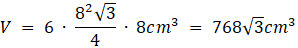 Krawędź graniastosłupa jest równa 8 cm. Objętość graniastosłupa to iloczyn pola podstawy i wysokości:
